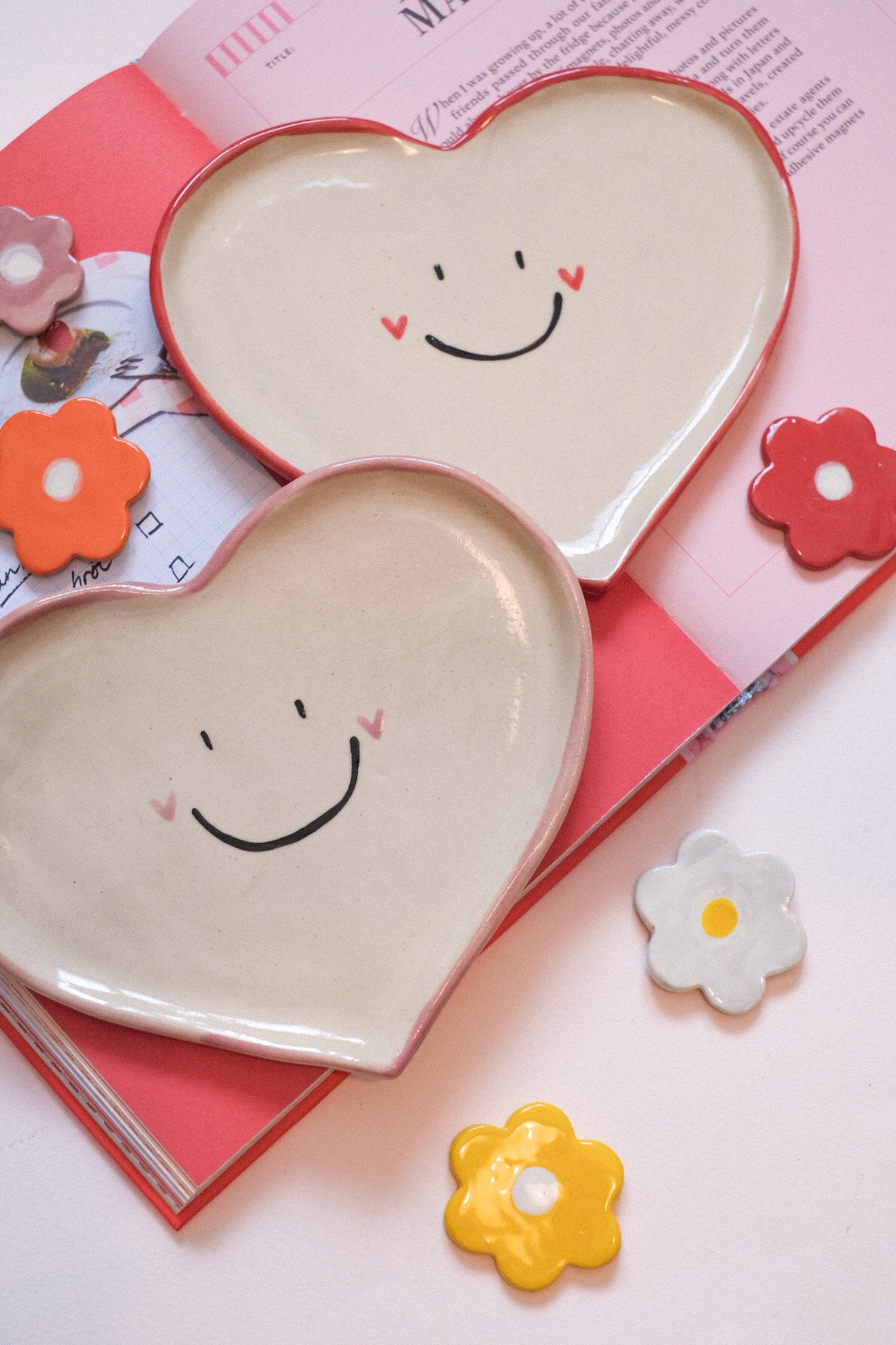 Craquez pour cette adorable assiette à dessert en forme de cœur. Modelée, peinte et émaillée à la main avec tendresse, chaque pièce est ornée d'un petit visage souriant plein de joie.