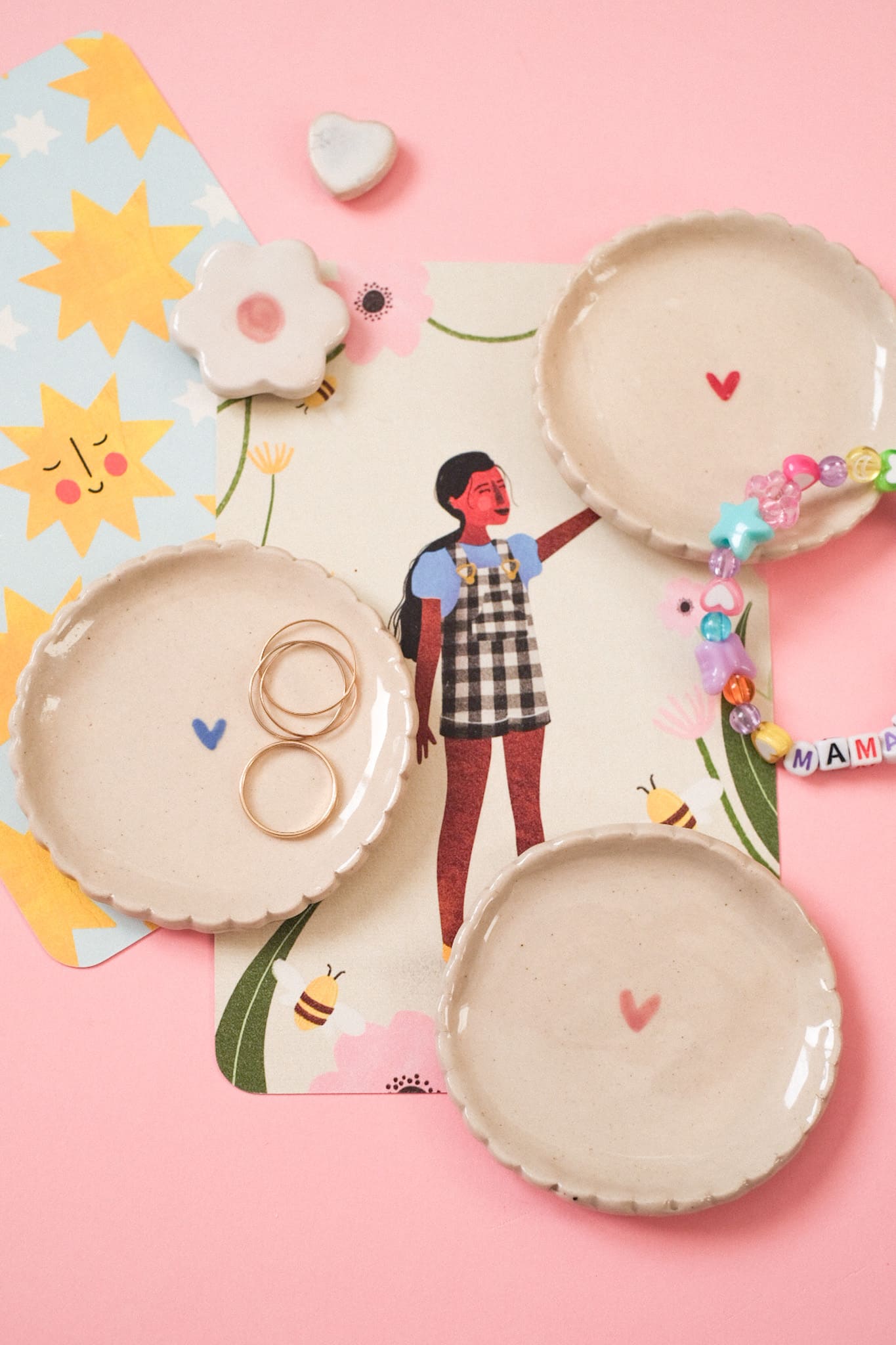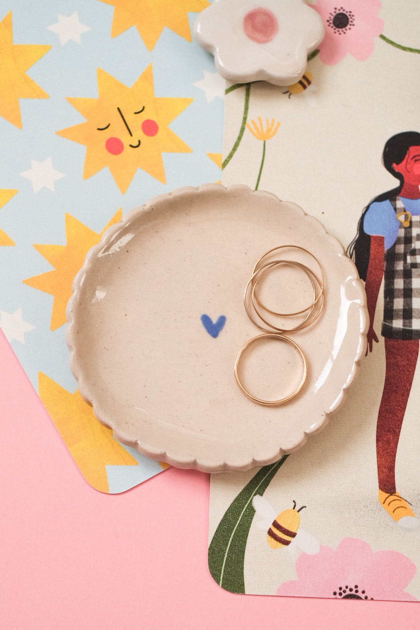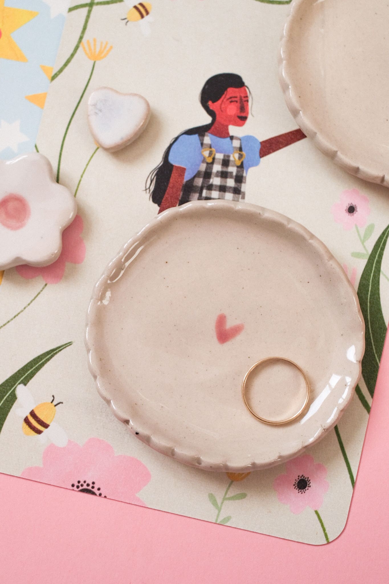 Une mini coupelle en céramique modelée et peinte à la main, elle est décorée d’un petit cœur coloré au centre.