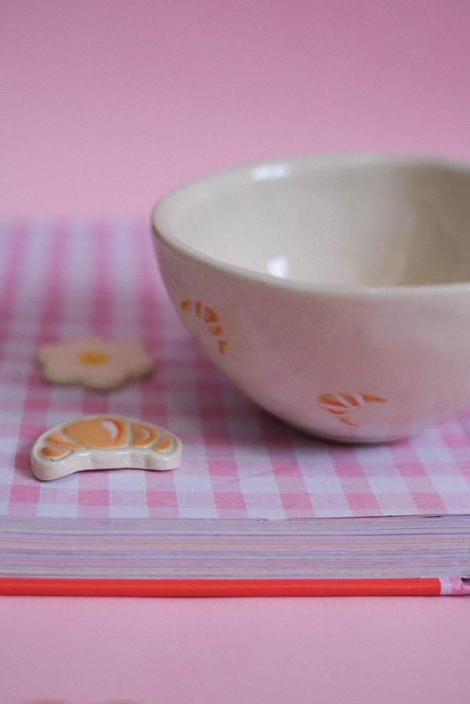 Ce petit bol en grès, modelé et peint à la main, a tout pour plaire aux amoureux du petit-déjeuner. Avec ses délicats motifs croissants à l’extérieur et un petit croissant en volume niché à l’intérieur, c’est un clin d'œil joyeux aux matins gourmands. Parfaitement adapté pour le café, le thé, ou même un petit chocolat chaud, il allie confort, humour et poésie.