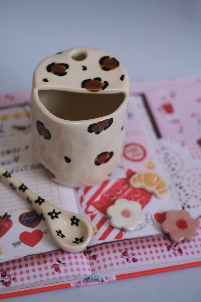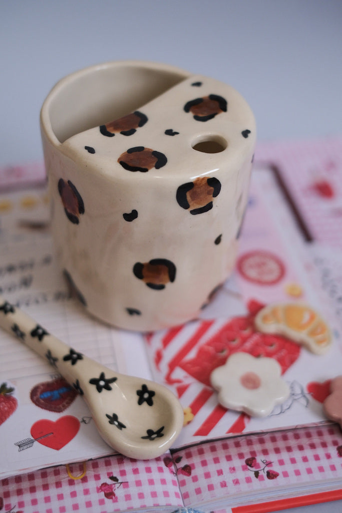 Je modèle ce travel mug en grès et le recouvre d’un motif léopard peint à la main. Les taches brunes et noires donnent un côté graphique à vos boissons du quotidien.